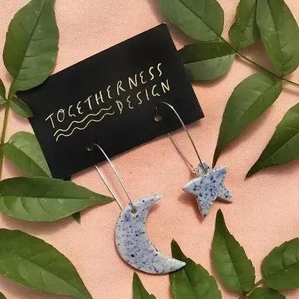 The Moon & Star earrings feature hand built ceramic pieces suspended on 35mm surgical steel hooks. These Ceramic Earrings are a bright and unique statement jewellery piece that are perfect with any outfit. As every piece has been made by hand they are each unique and may slightly differ from pictures.