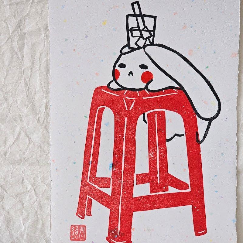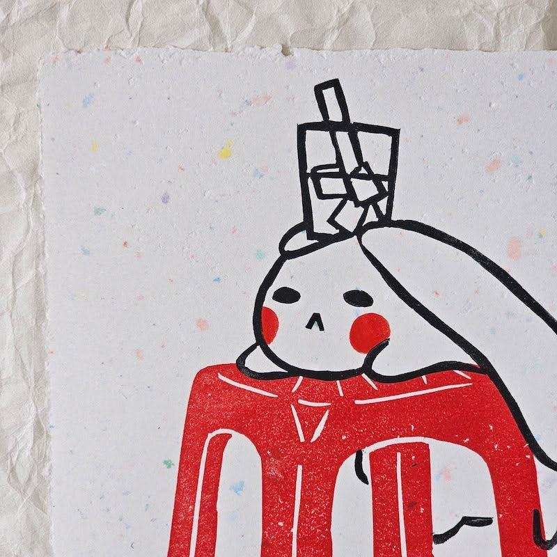 'Red Chair Bunny (3)' A4 Lino Print on Dodgy Paper