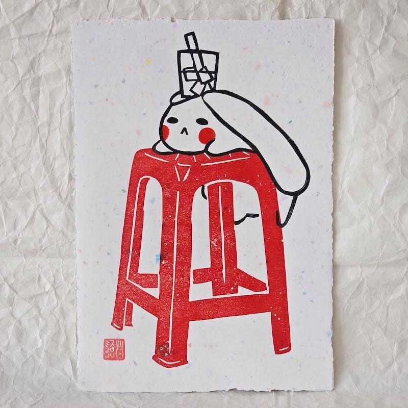 Misu Juju is the playful creation of Julie Nguyen, a self-taught artist based in Naarm (Melbourne). Her work spans multiple mediums, with a focus on lino printing, experimenting with handmade papers and happy accidents that give each piece character. Inspired by everyday joys, Japanese pop culture and her own cultural roots, Julie captures quiet moments and quirky details, creating whimsical artwork that adds a touch of magic to the everyday.