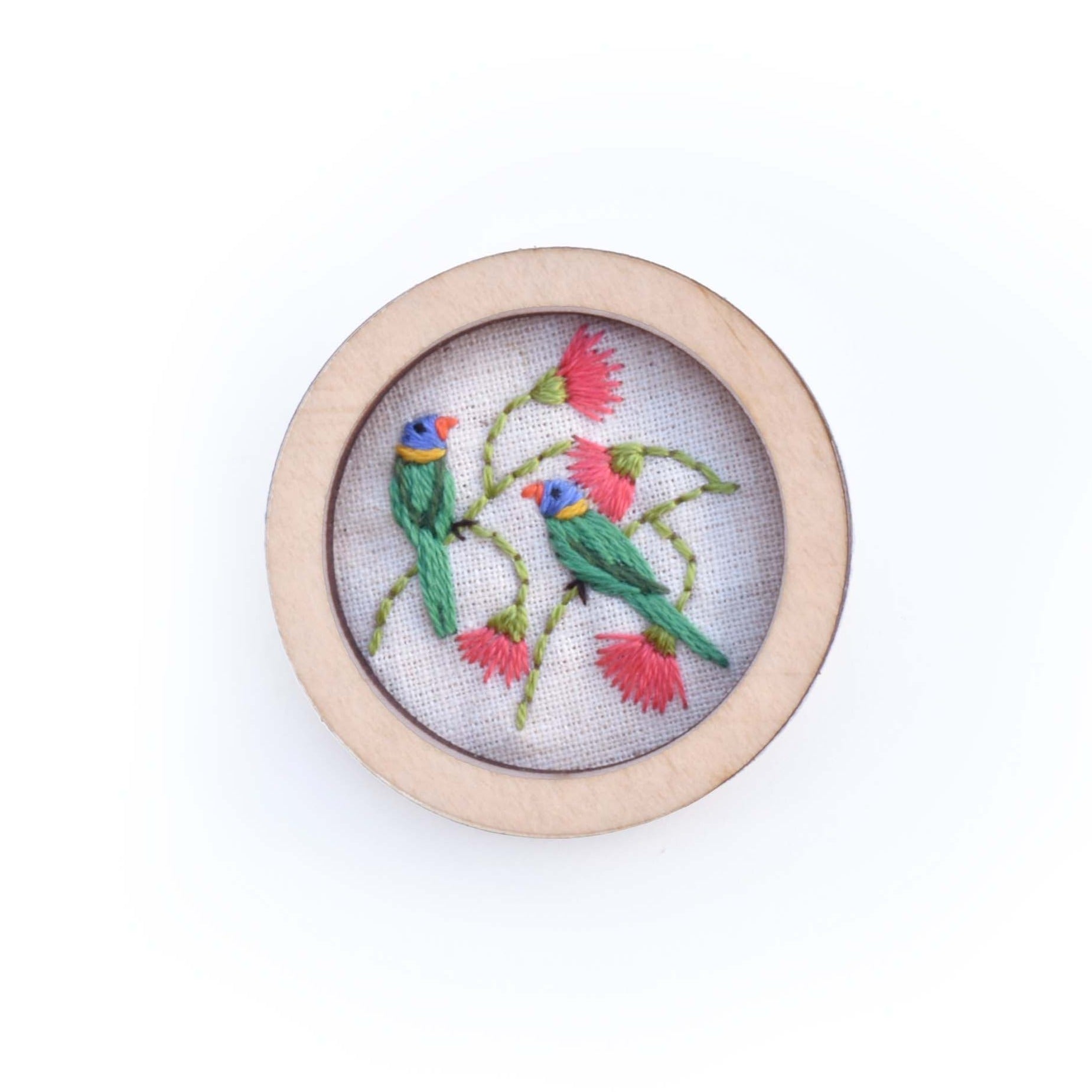 Beautifully hand embroidered lorikeets on natural cotton fabric created into a round wooden brooch-pendant.