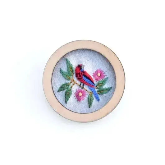 Beautifully hand embroidered rosella on natural cotton fabric created into a round wooden brooch-pendant.