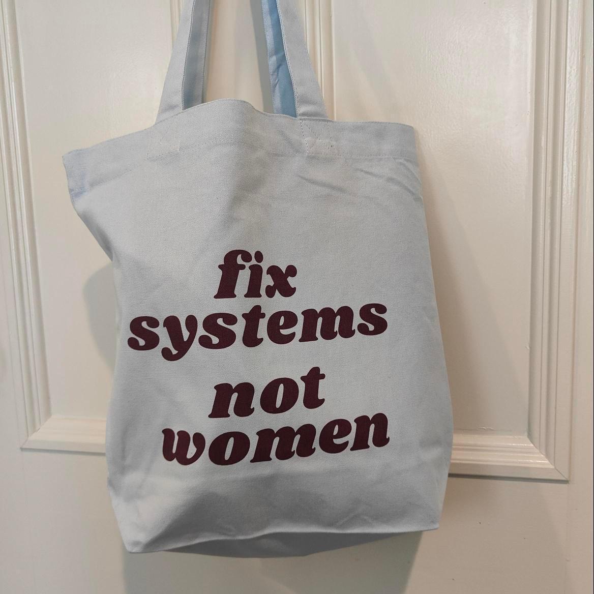Carry your essentials with purpose! Our durable, reusable Women in Super tote bag is perfect for everyday use, groceries…or work. It features the empowering slogan: Fix systems, not women – and is a stylishly sassy statement of support for gender equality.