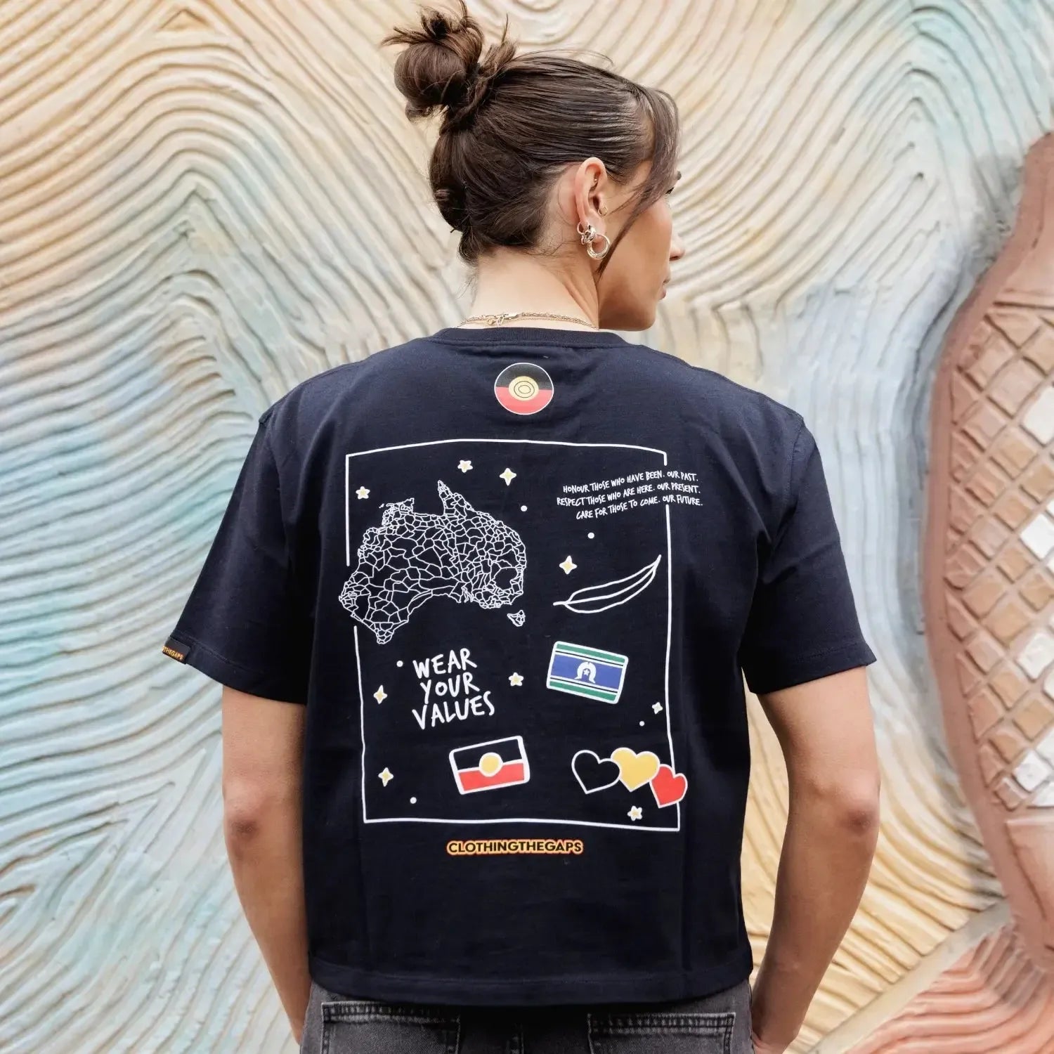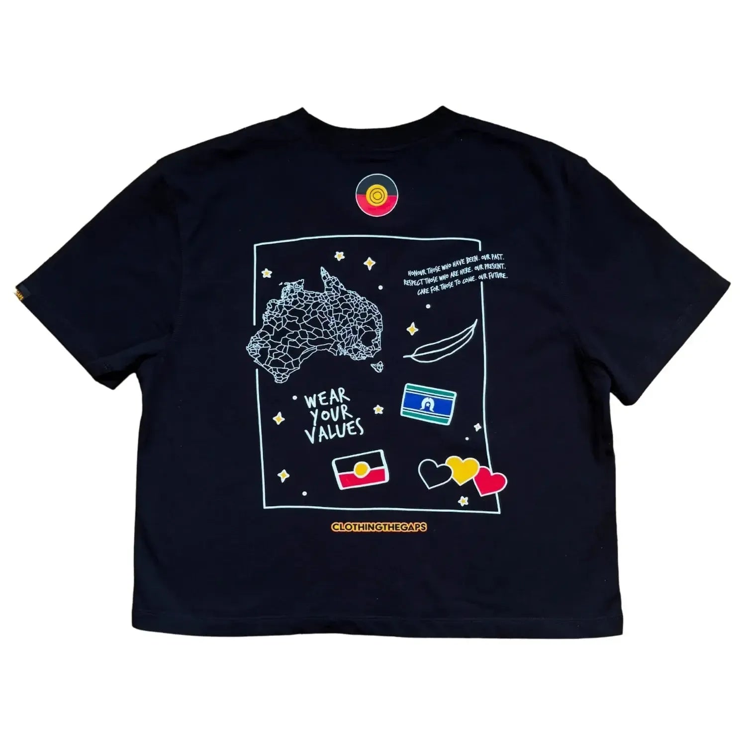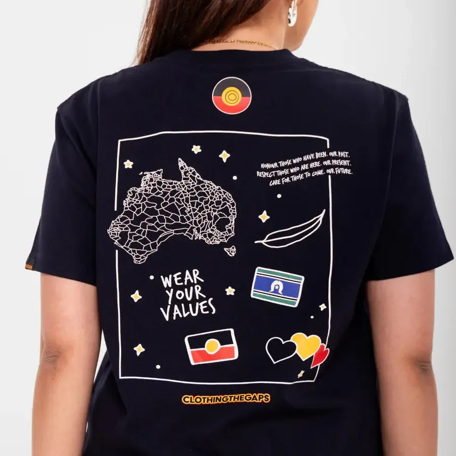 On the back, you’ll find a bold collection of symbols, including the Aboriginal and Torres Strait Islander flags and a decolonised map of “Australia,” representing resistance, pride, and connection.