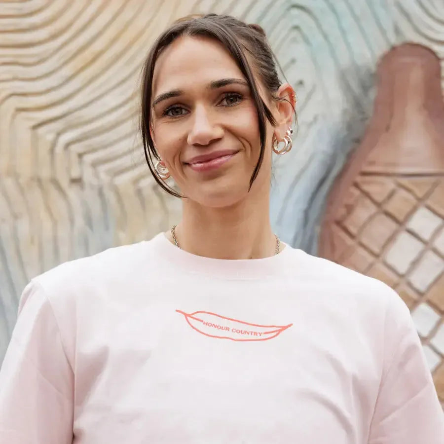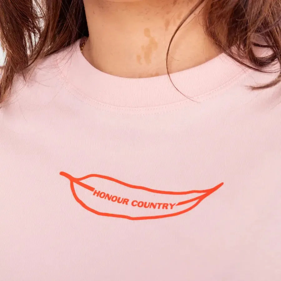 Made in a soft pink and finished with bold red text, the Honour Country Tee invites us to pause and reflect.