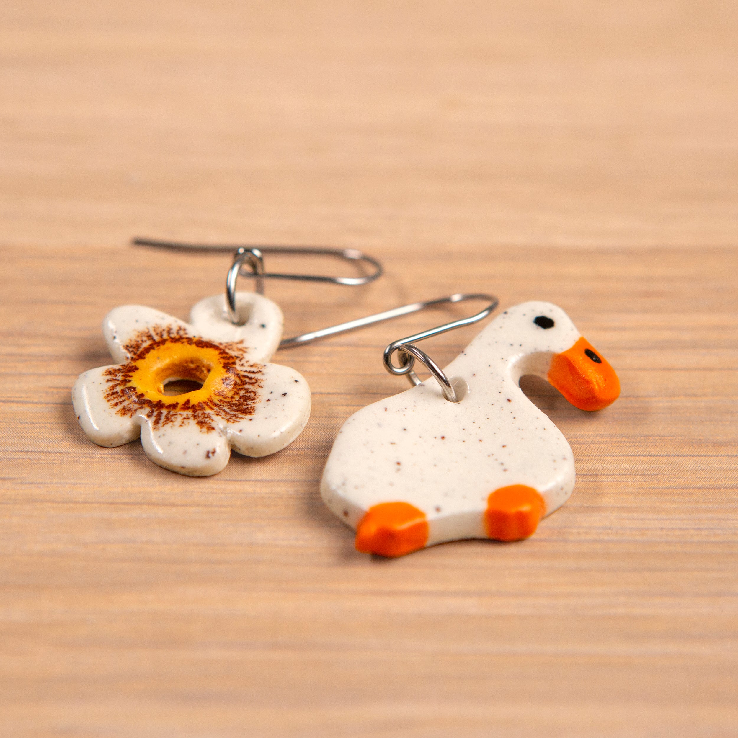 Add a splash of whimsy to your outfit with these handmade ceramic drop earrings, featuring a cute white duck & white flower design. Lightweight and full of personality, they’re a sweet everyday accessory or a charming handmade gift.