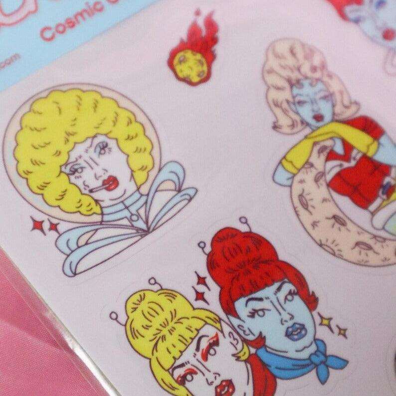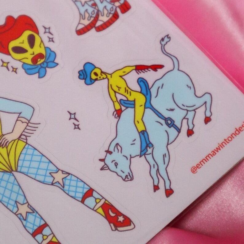 This sticker sheet is packed with bold, colorful illustrations featuring space cowgirls, alien rodeo riders, glittering boots, and out-of-this-world cosmic babes. Think vintage Western charm colliding with star-soaked galaxy energy, perfect for anyone who loves a little kitsch, glam, and yeehaw chaos