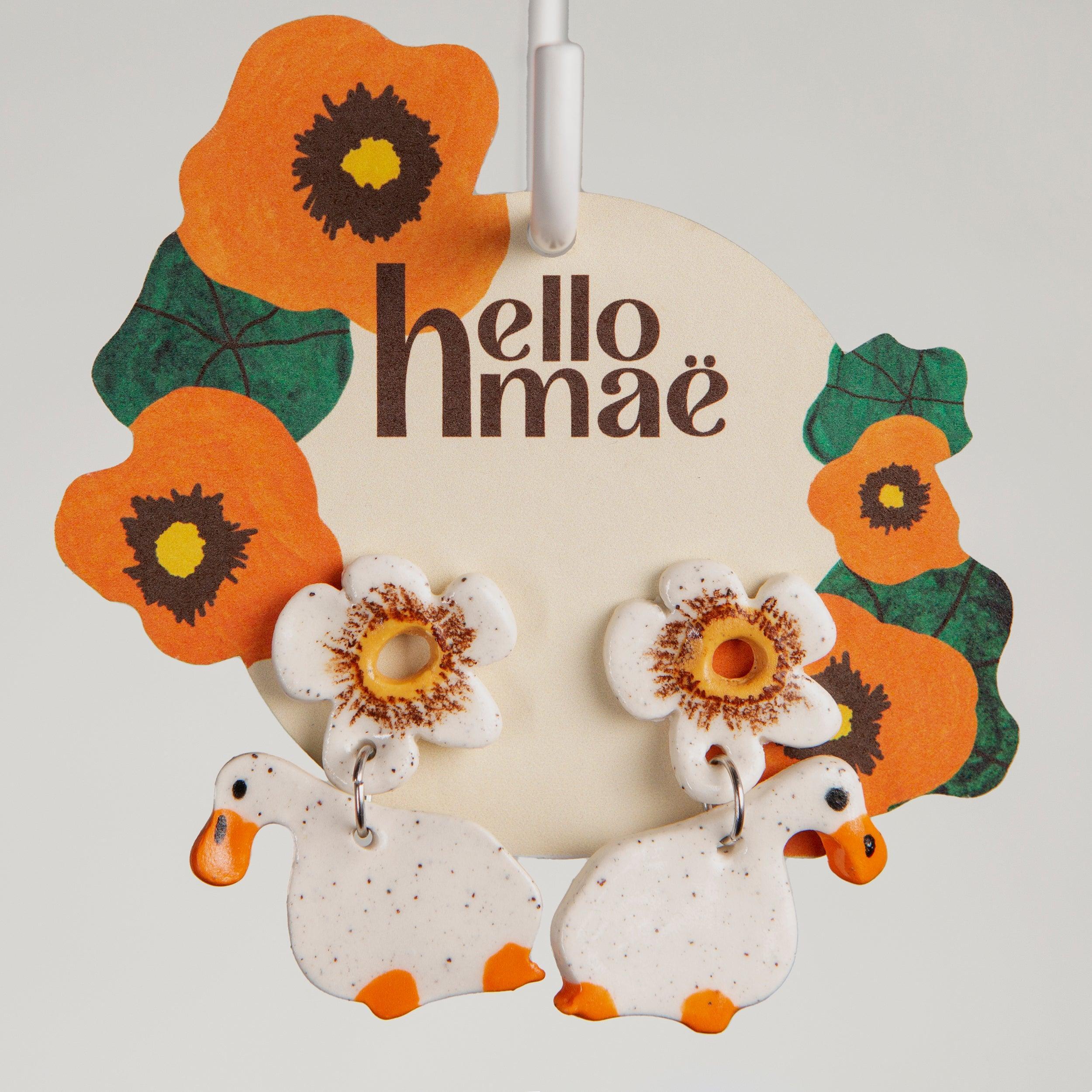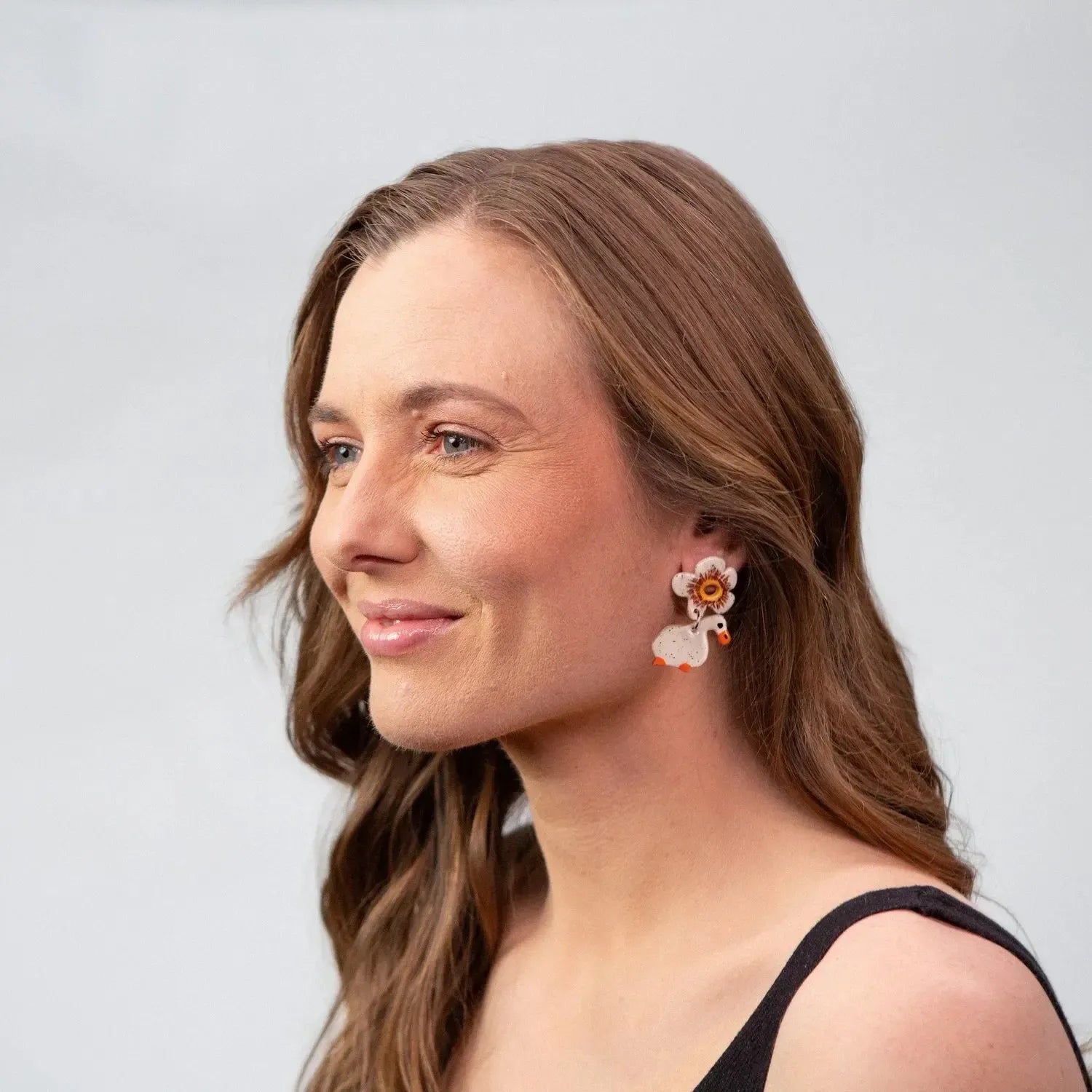 Turn heads with these joyful two-tier ceramic earrings, hand-built and painted in our Melbourne studio. Featuring white flowers & cute white ducks, each pair brings a playful pop of colour and charm to any outfit.