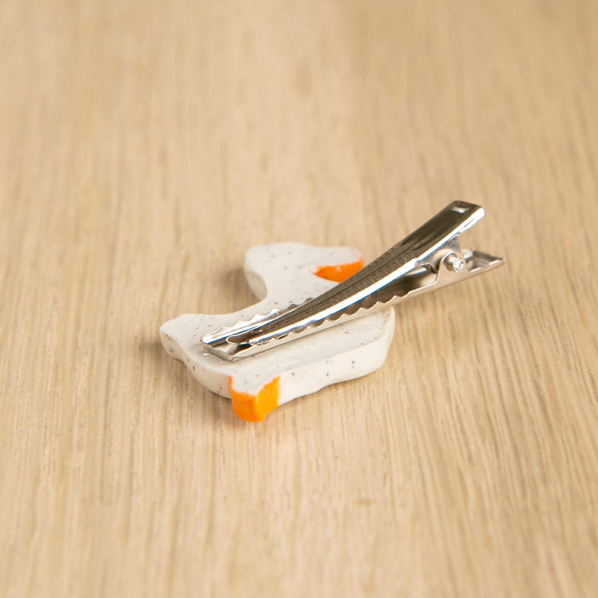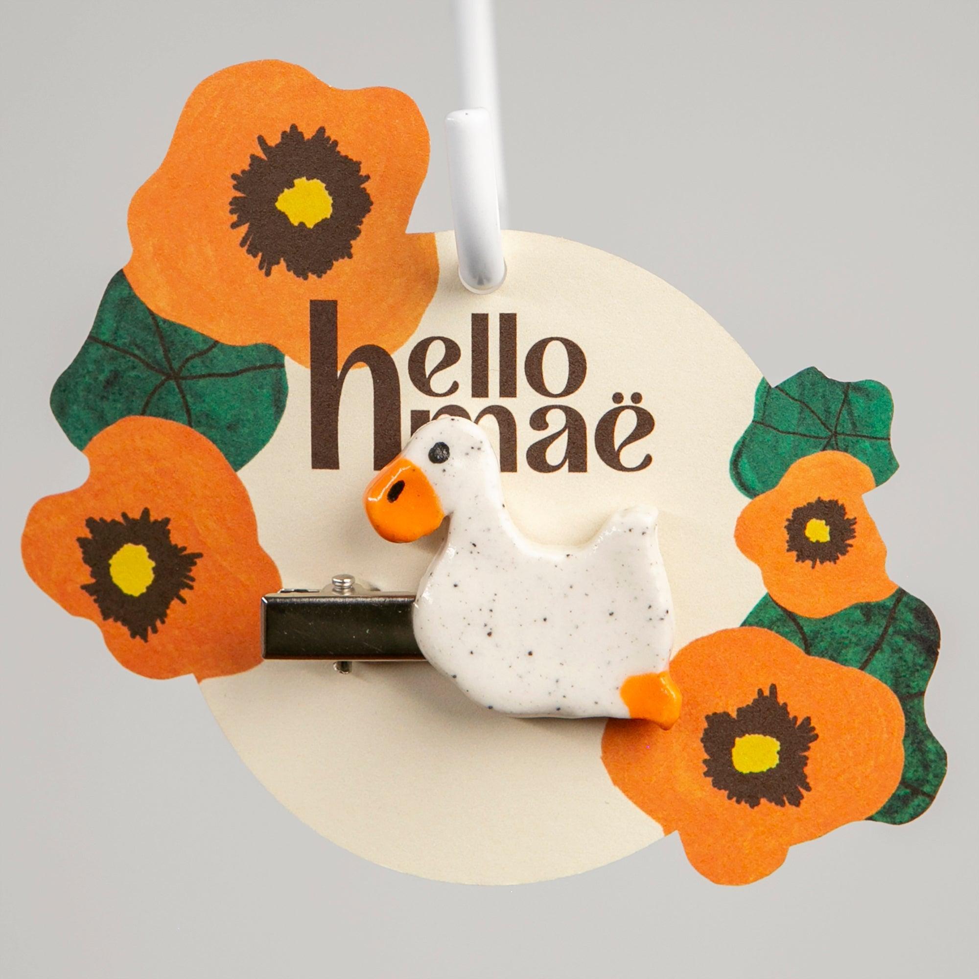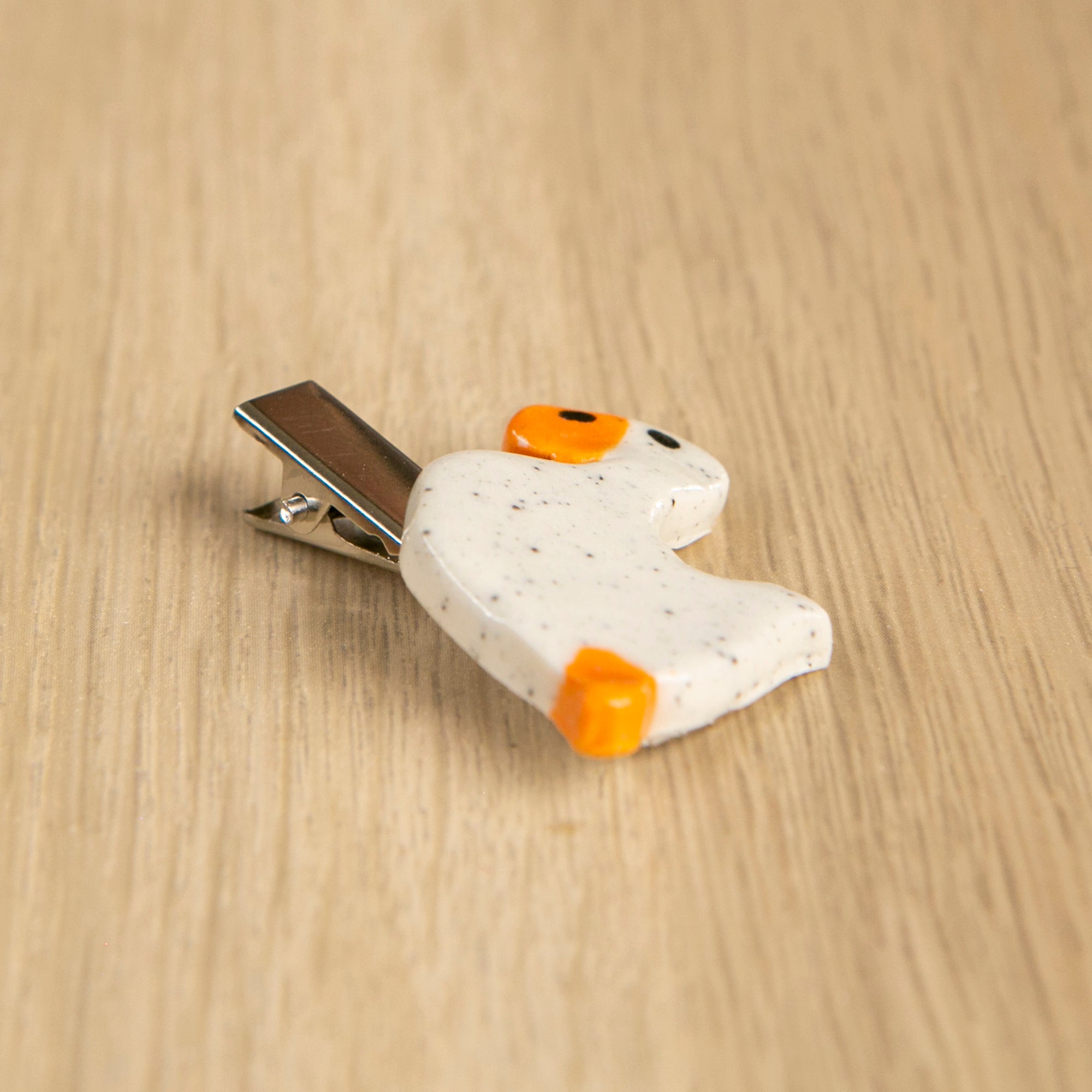 This sweet ceramic hair clip features a hand-shaped and hand-painted swimming duck - the perfect tiny detail to brighten your hairdo. Attached to a sturdy alligator-style clip, it holds securely while adding a playful pop of charm to your everyday look. Wear it to pin back your hair or add a whimsical touch to your bun - either way, it’s sure to make you smile.