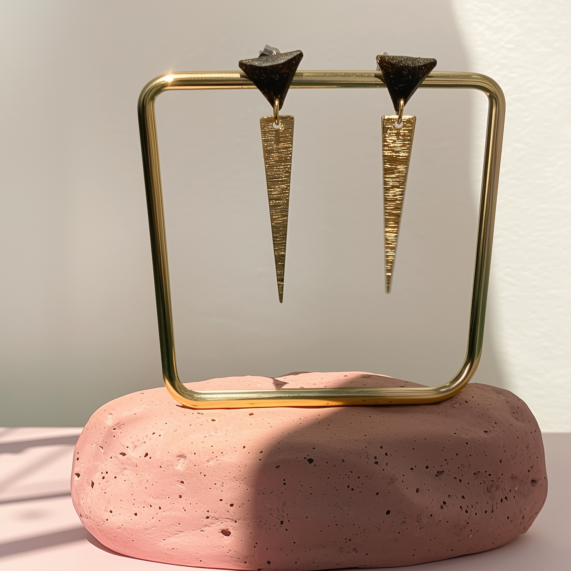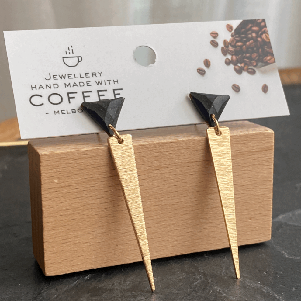 Texture meets geometry. Each earring pairs a facetted dark triangle made from recycled coffee grounds and gold powder with a sleek, brushed 18K gold-plated spear. Light yet striking.