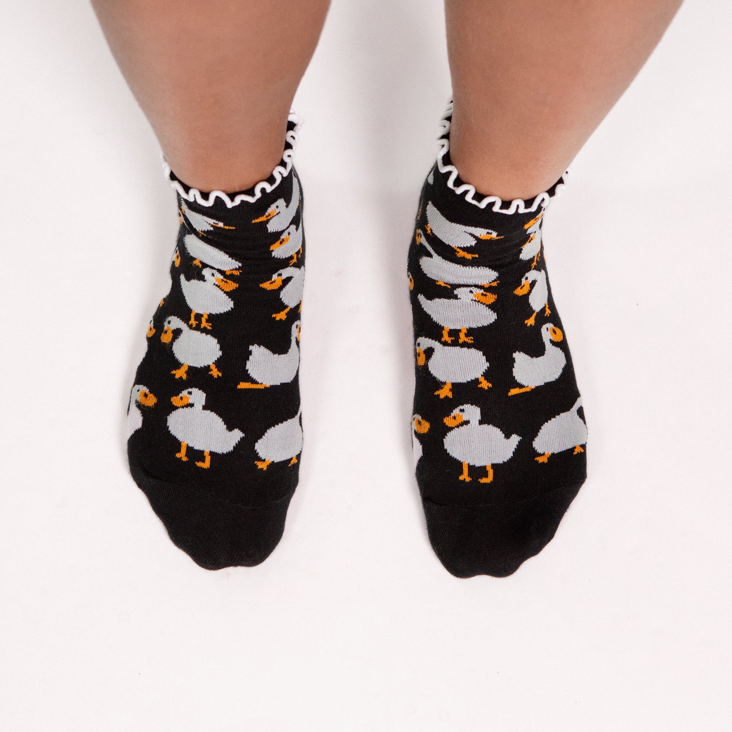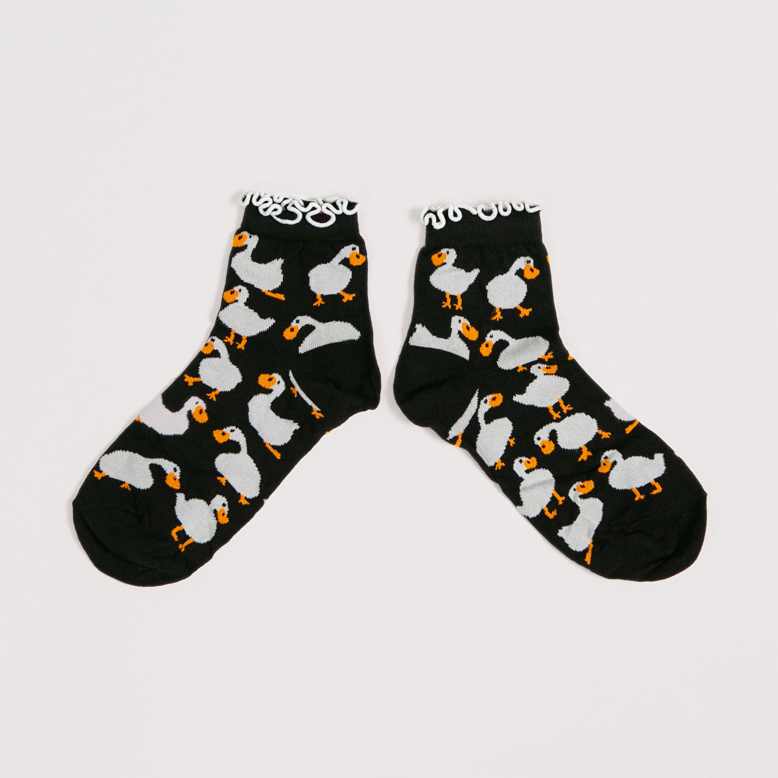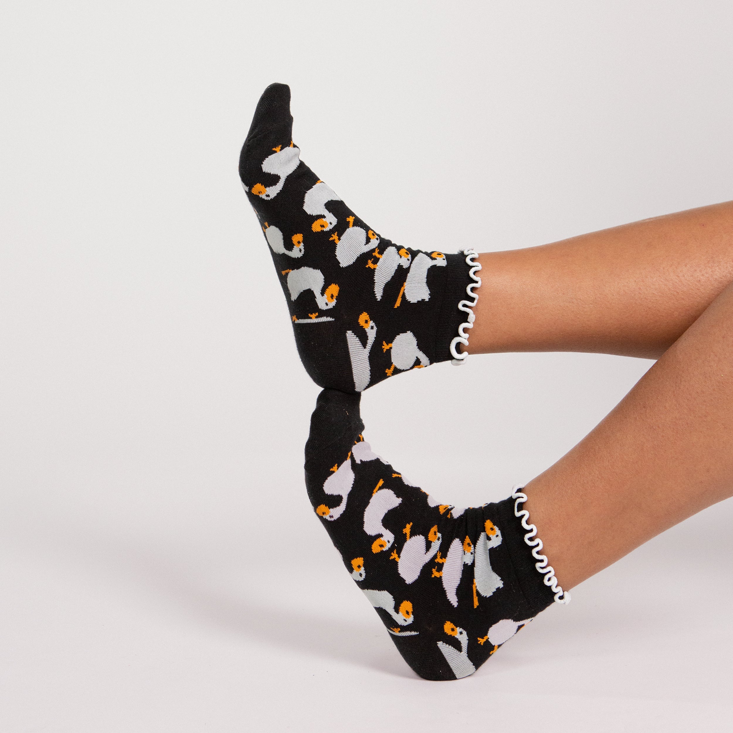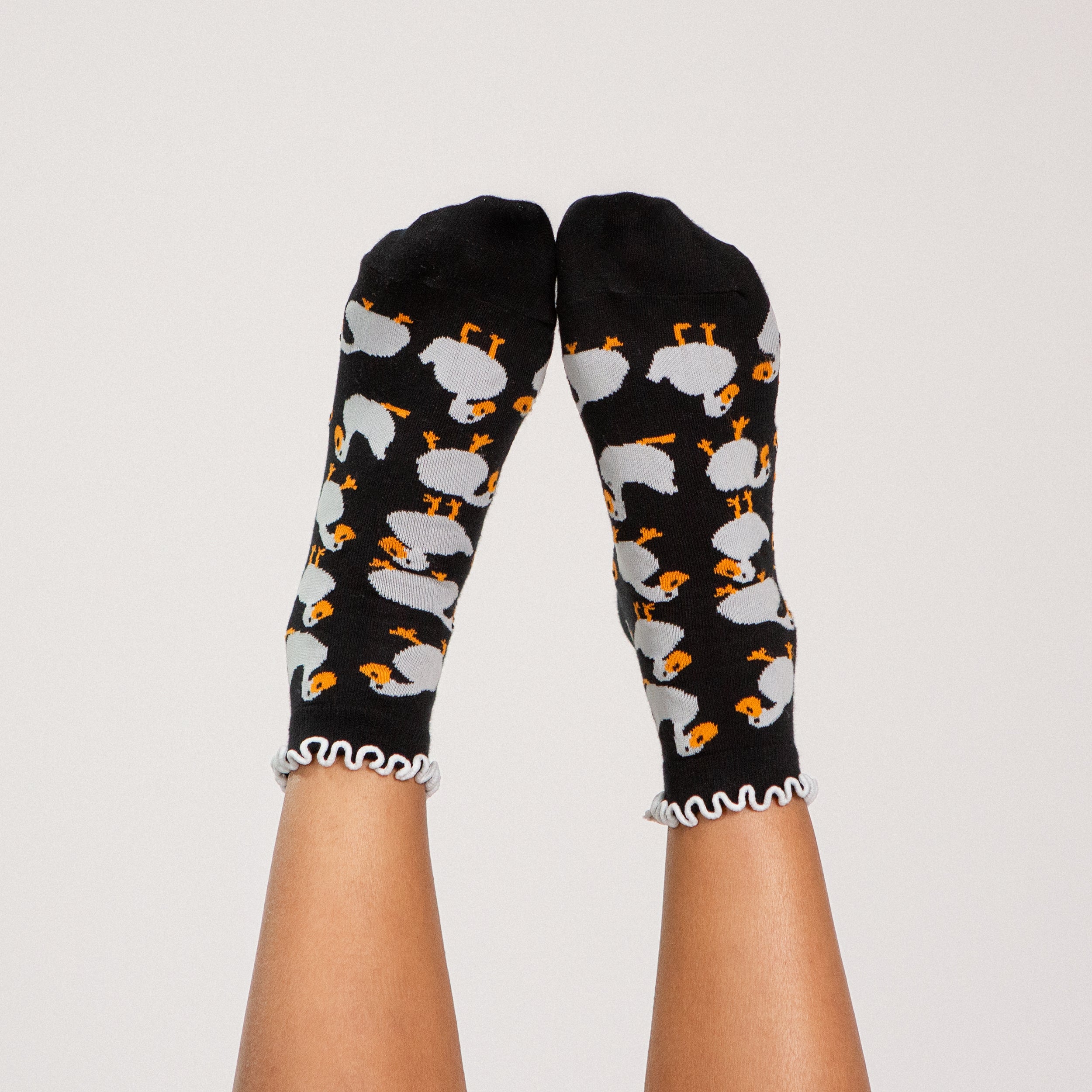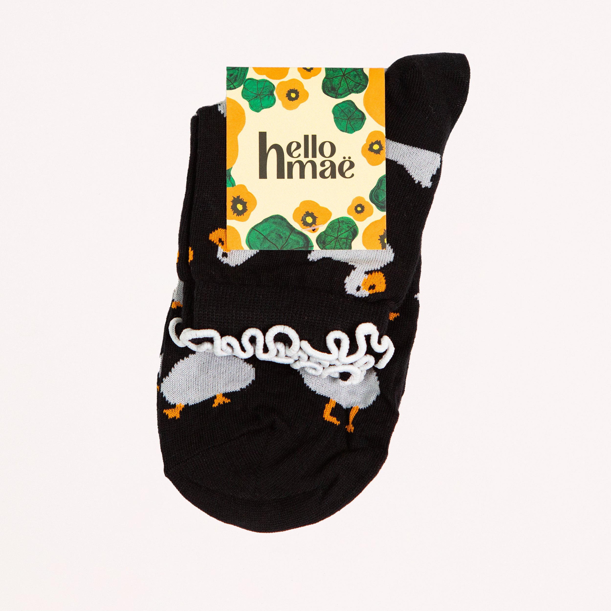 These sweetest socks feature hand-drawn ducks, knitted into a deep black base. Designed in Melbourne using original hellomaë artwork, and with with its white contrast top frill, they’re the perfect mix of comfort, colour, and playful charm.