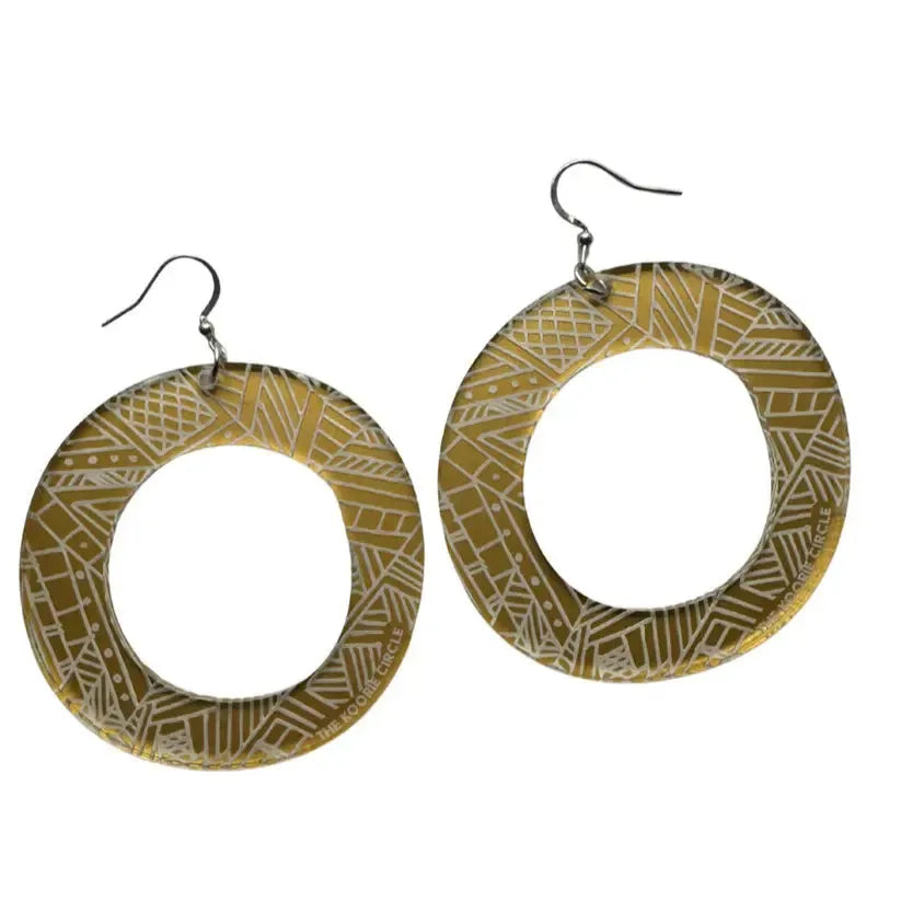 Stunning statement hoop earrings featuring Victorian Aboriginal line artwork by Gunditjmara woman, Laura Thompson.