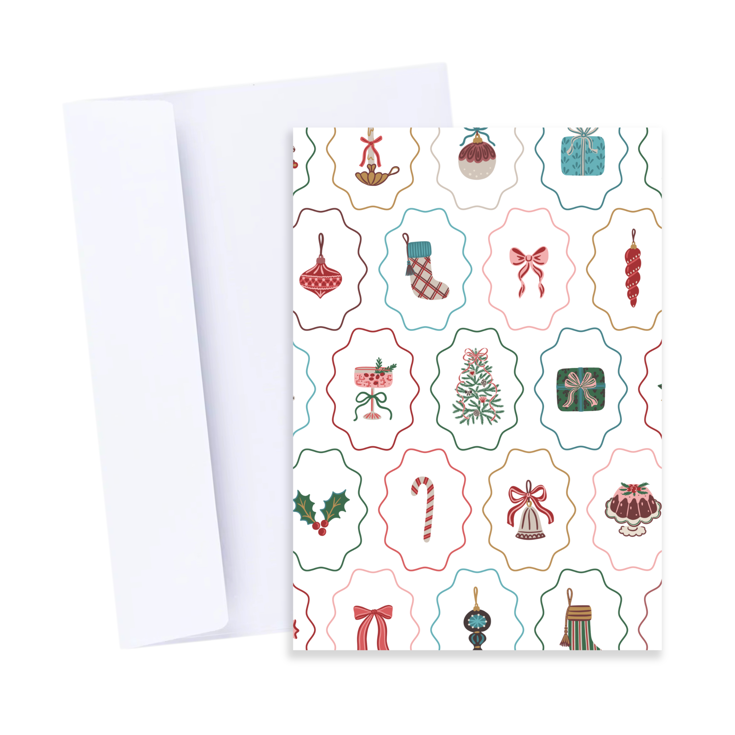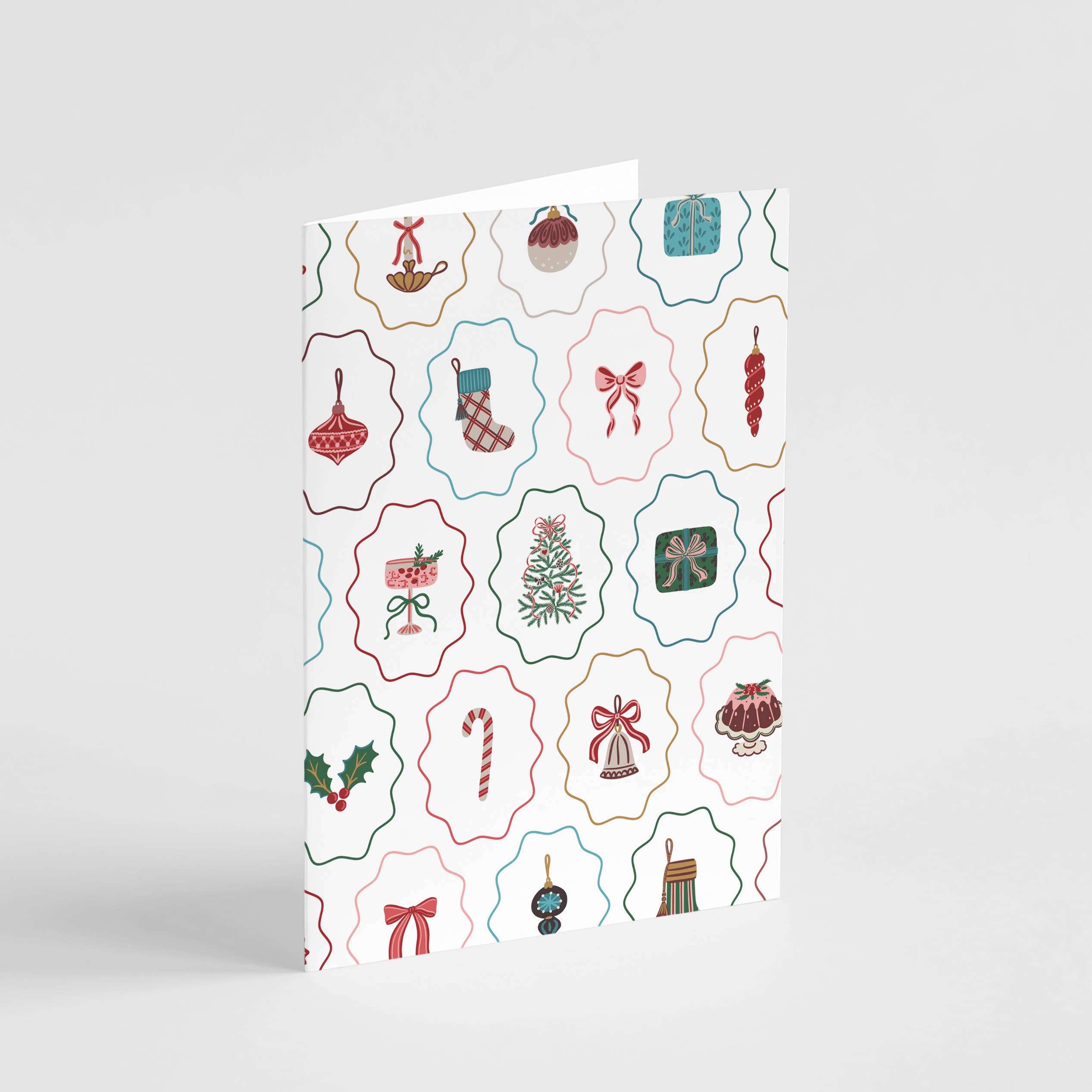 A vintage-style Christmas card with hand-drawn festive icons in rich seasonal colours. Great for stockists serving customers who love nostalgic, festive greeting cards. Works beautifully in boutique stores and as part of curated seasonal card ranges.
