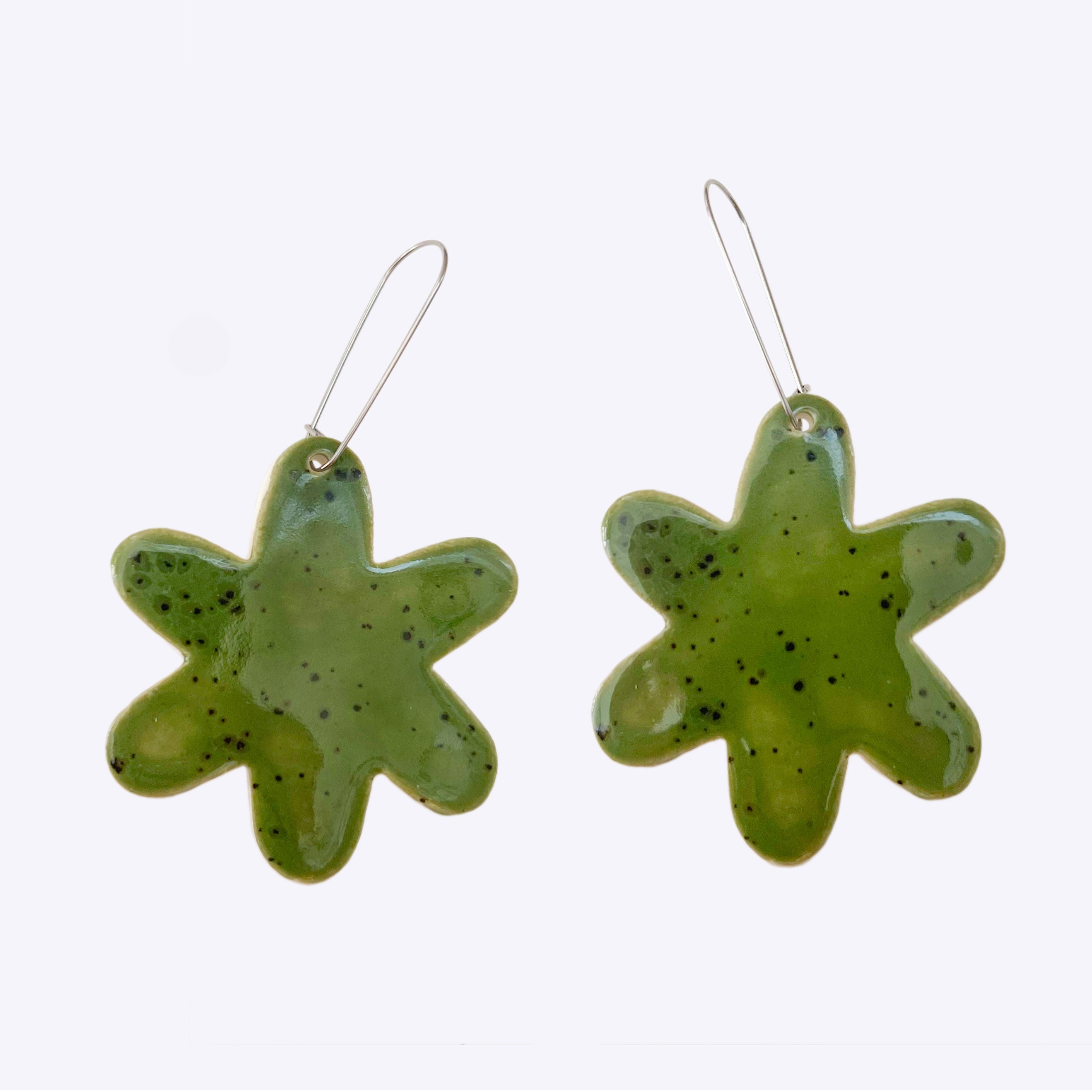 The Flowerburst earrings feature mismatched lightweight hand built ceramic pieces suspended on 35mm surgical steel hooks, handpainted by designer Esther Sandler.