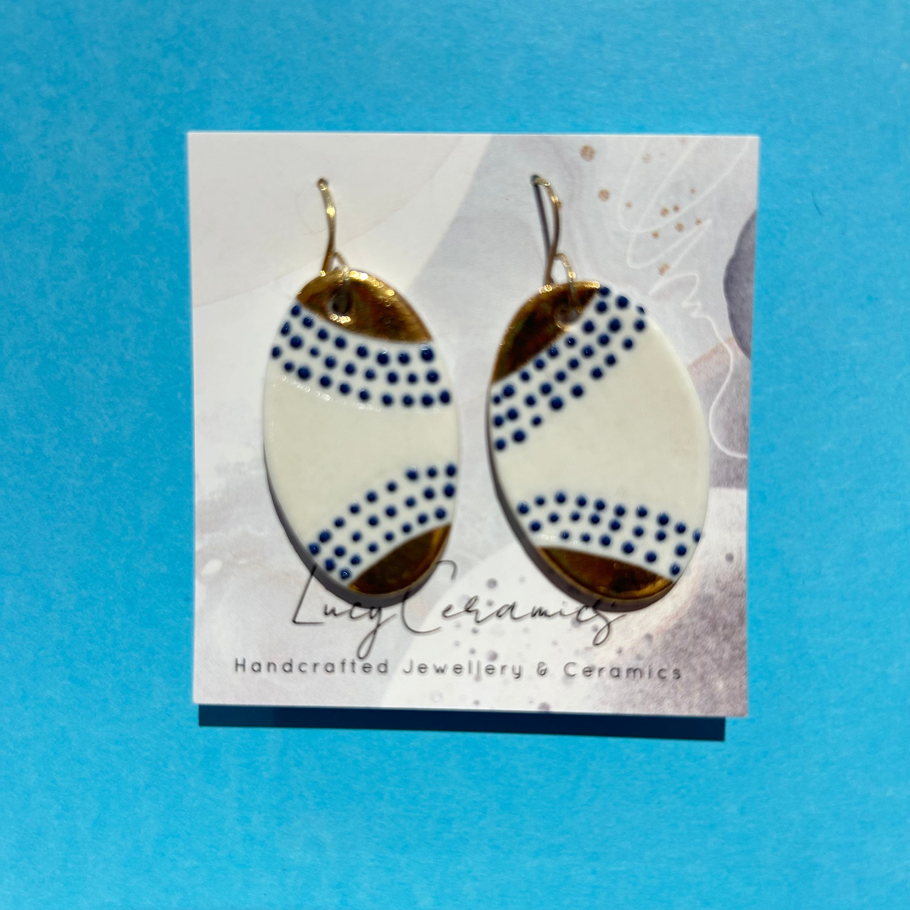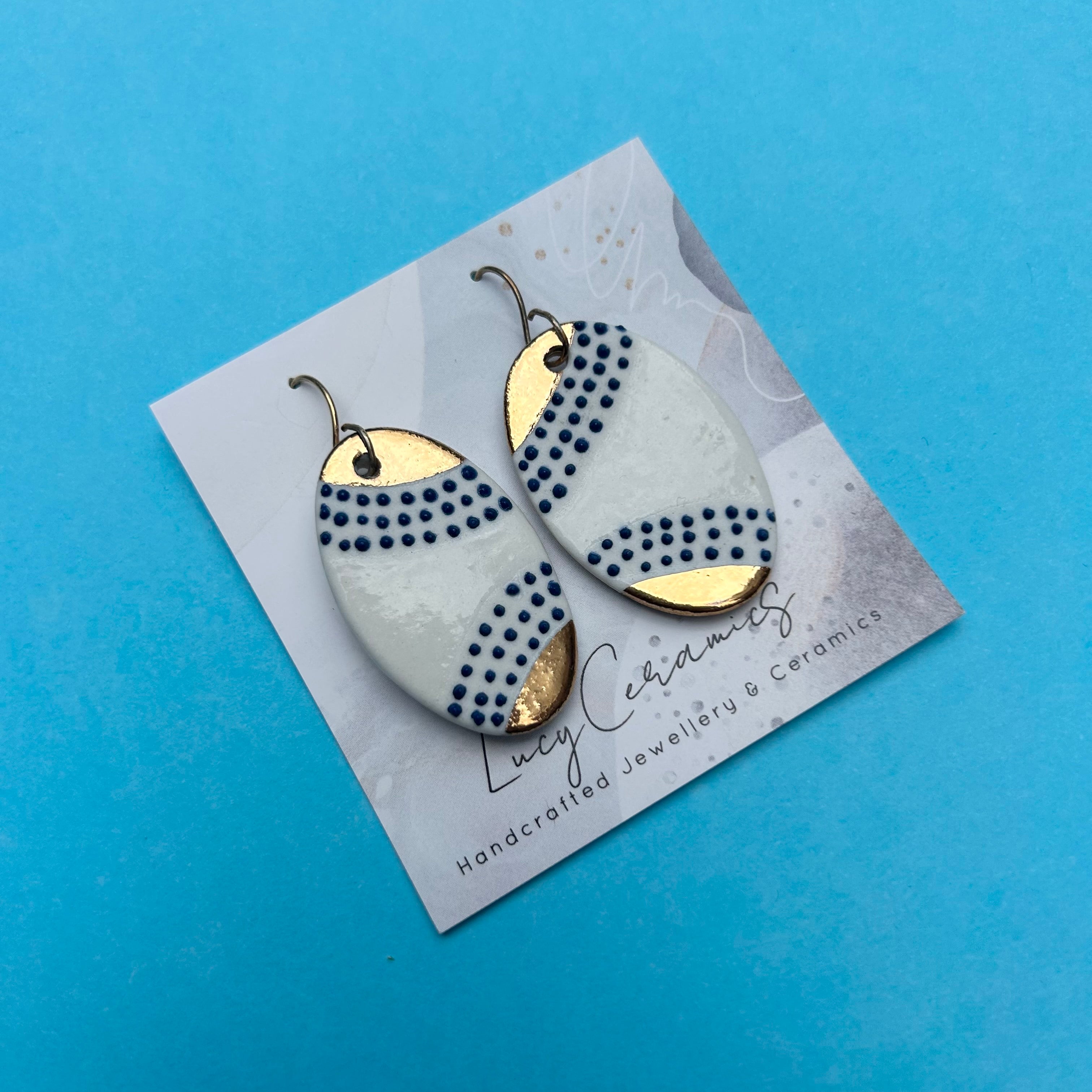 3 blue line dots oval Porcelain earrings