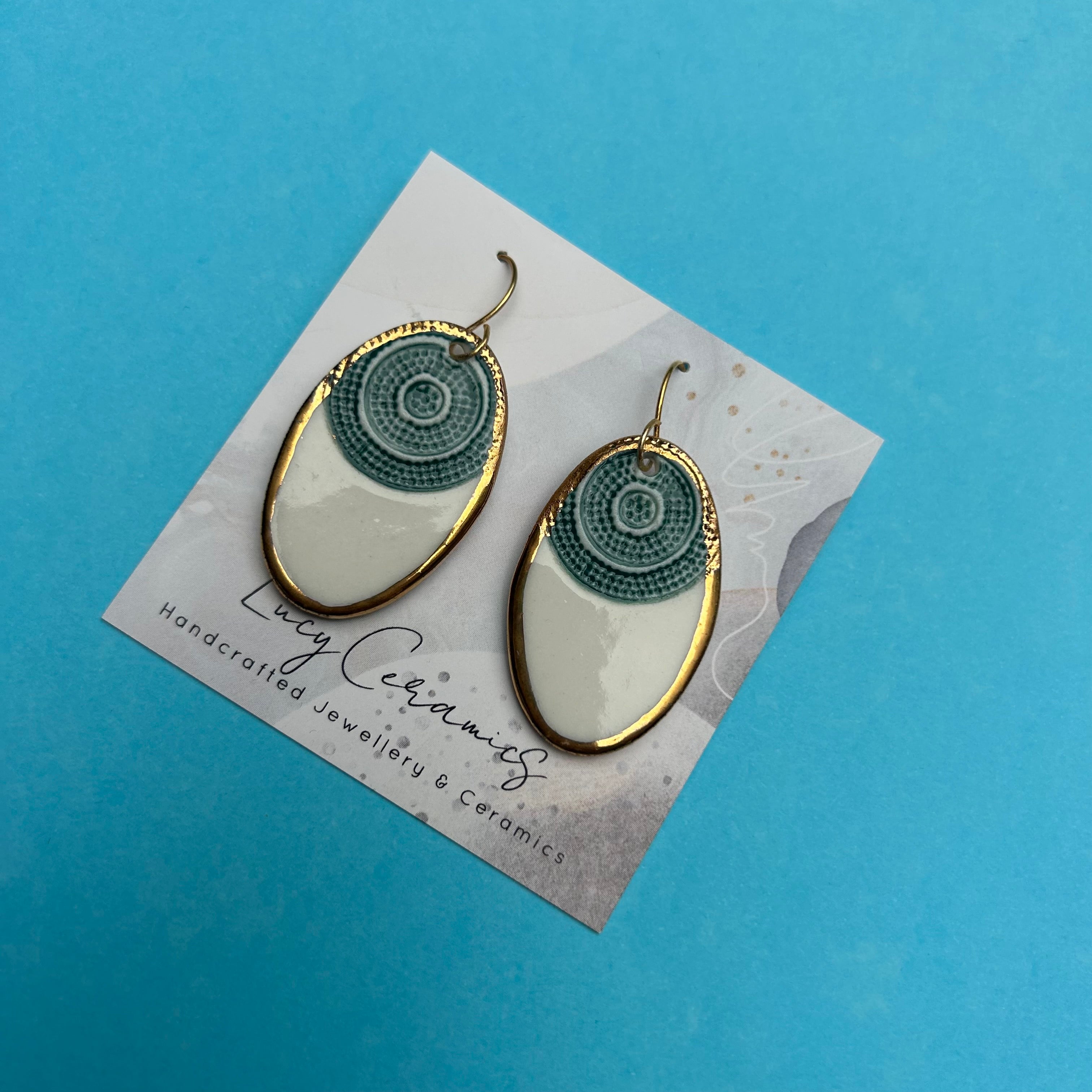 Green circle pattern embossed oval Porcelain earrings