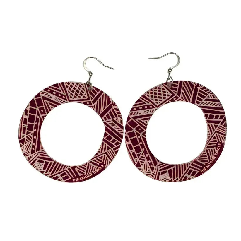 Stunning statement hoop earrings featuring Victorian Aboriginal line artwork by Gunditjmara woman, Laura Thompson.