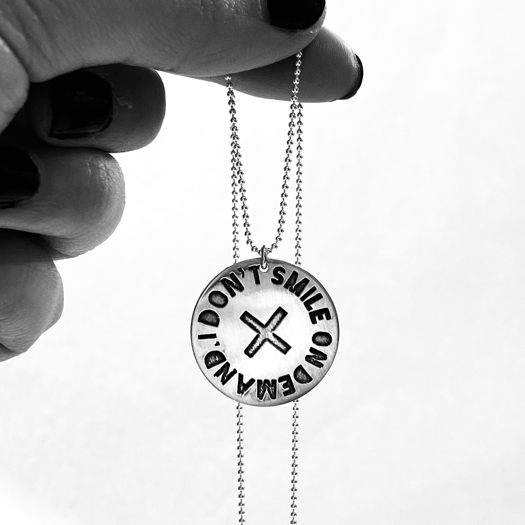 A large sterling silver disk has been etched with the statement "I DON'T SMILE ON DEMAND". A bold cross has been etched into the centre to drive the message home. The etched text has been oxidised to highlight it and the pendant has been polished to a very smooth soft matte finish.