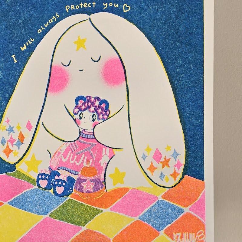 Misu Juju is the playful creation of Julie Nguyen, a self-taught artist based in Naarm (Melbourne). Her work spans multiple mediums, with a focus on lino printing, experimenting with handmade papers and happy accidents that give each piece character. Inspired by everyday joys, Japanese pop culture and her own cultural roots, Julie captures quiet moments and quirky details, creating whimsical artwork that adds a touch of magic to the everyday.
