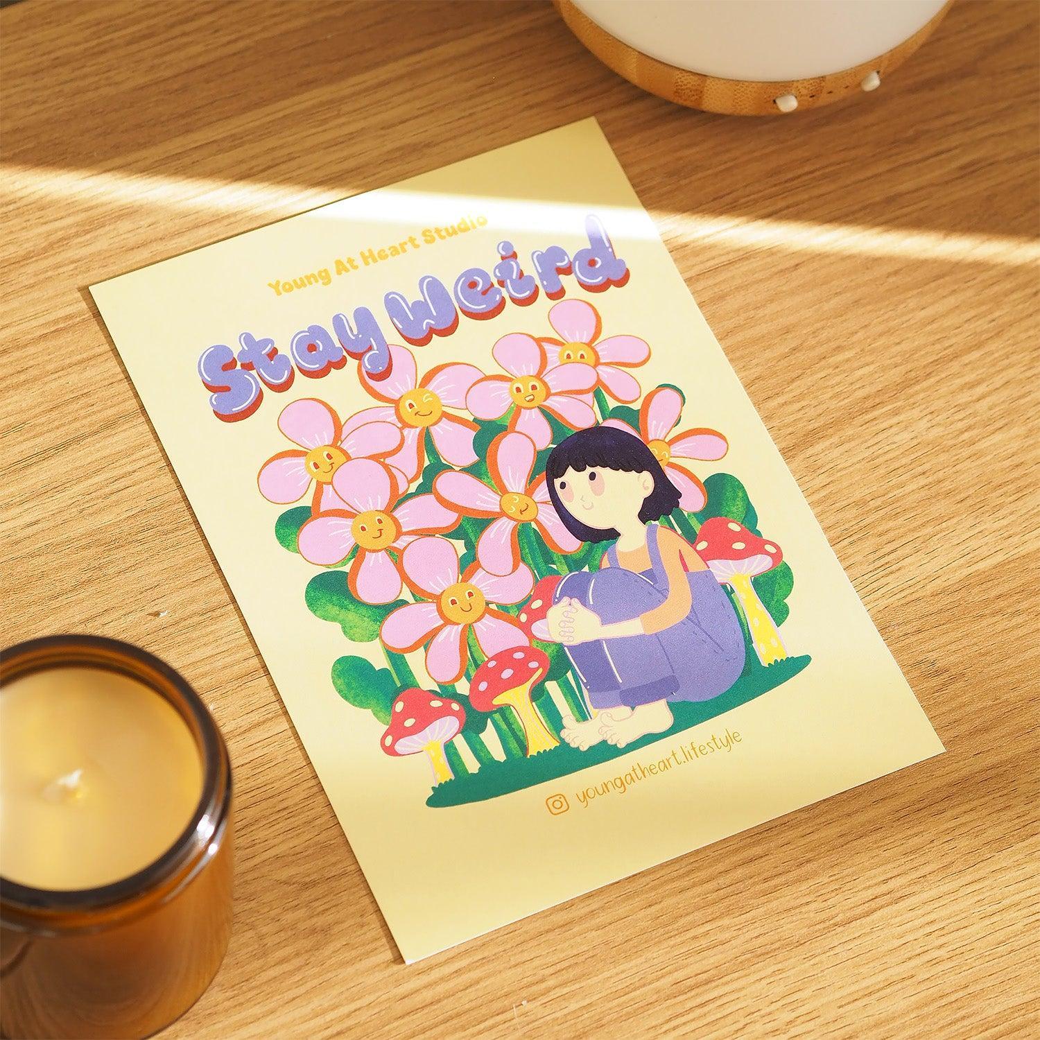 Celebrate the magic of being yourself with Stay Weird, a whimsical illustration of a girl sitting among oversized mushrooms and gazing up at a bright blue sky. Designed at Young At Heart Studio and printed in Australia on premium 350gsm stock, this art print features rich colours and crisp detail, available in A4 size.