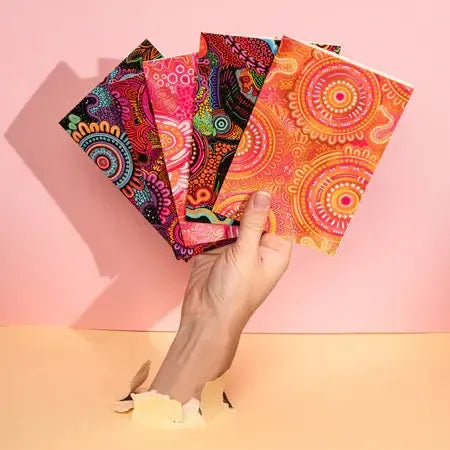 There are 5 cards in each pack with unique artworks that celebrate Country and culture. Each card is blank inside so you can write your messages however you want to and comes with a plain white envelope ready to send to your loved ones.