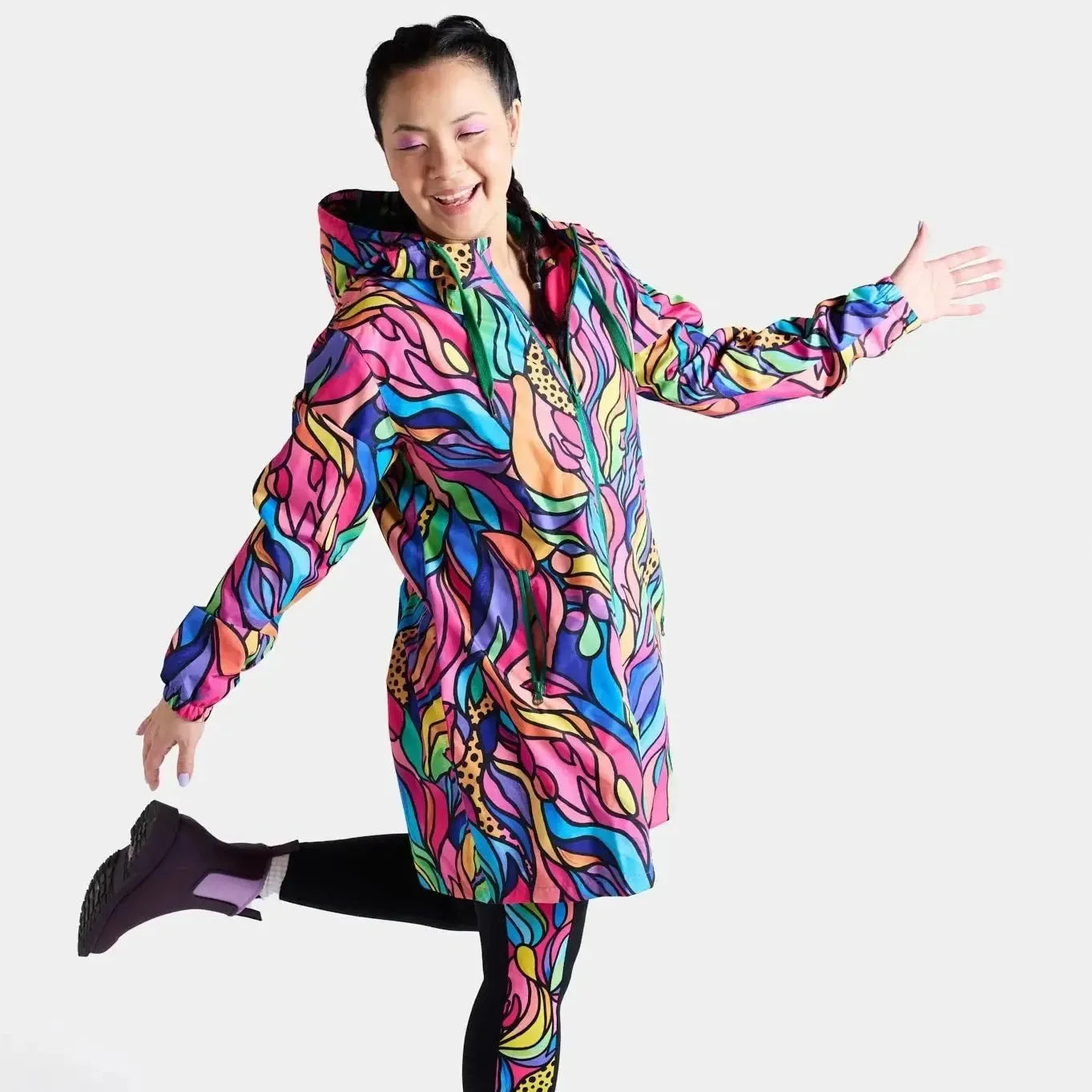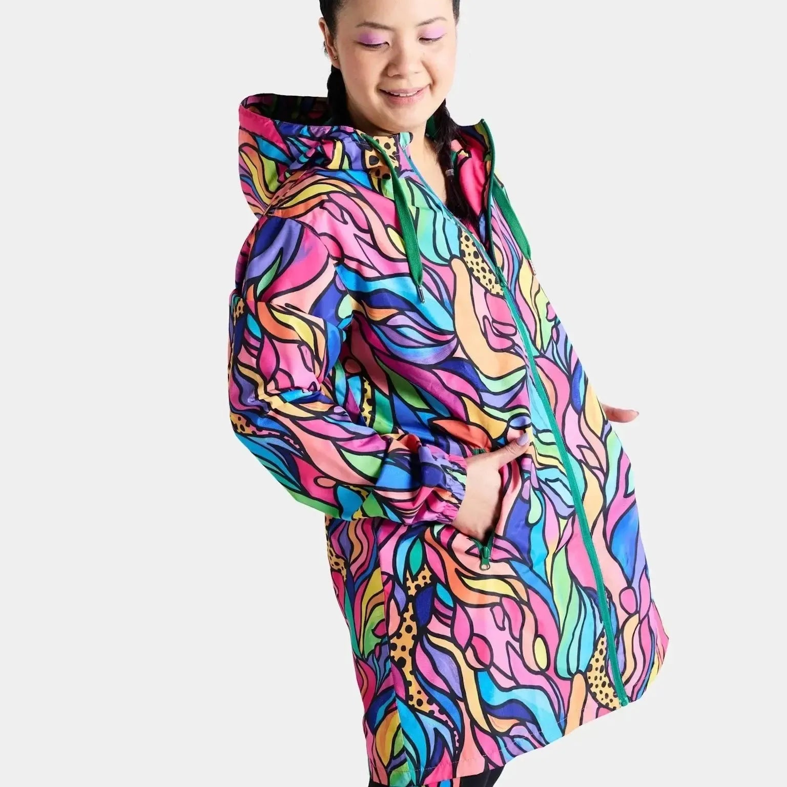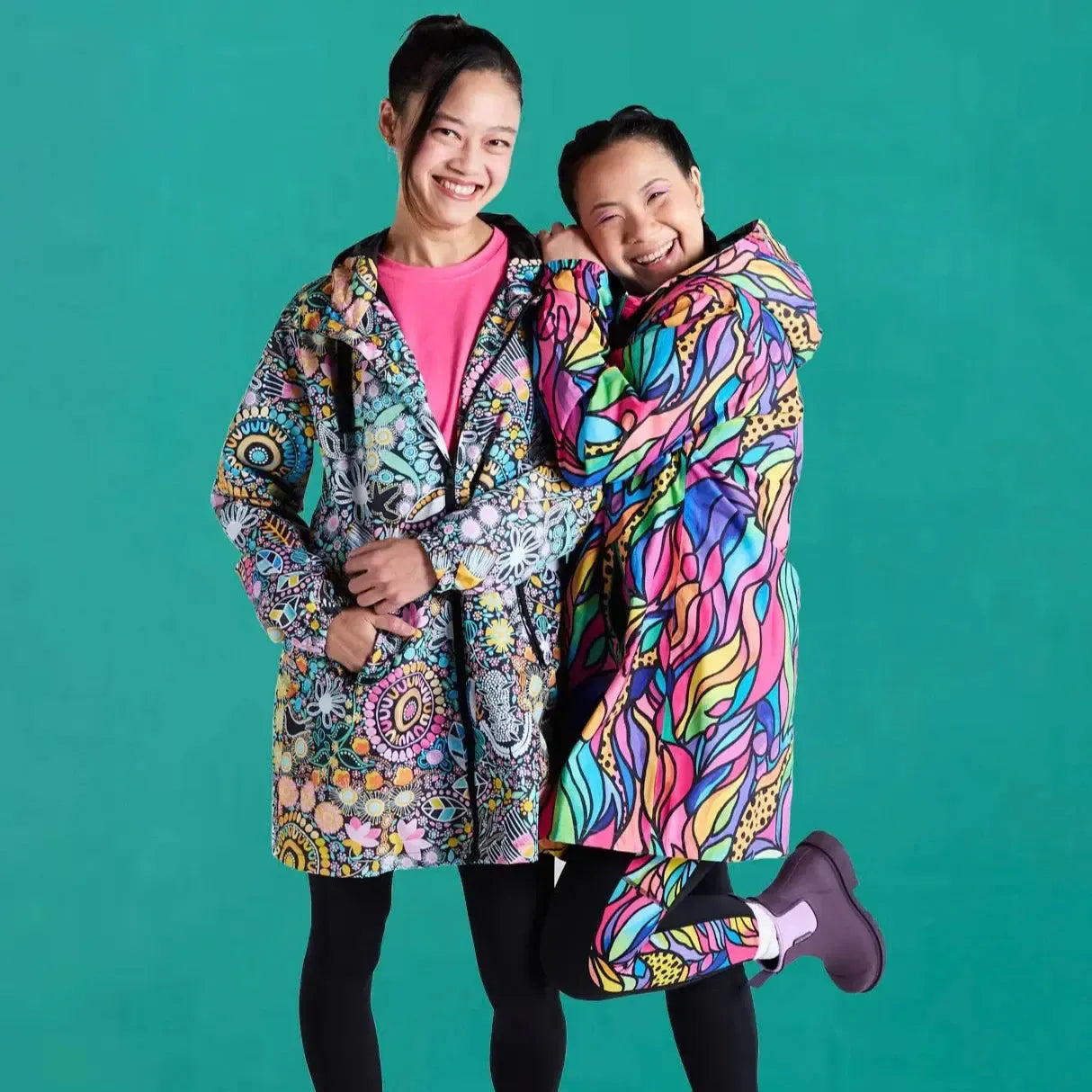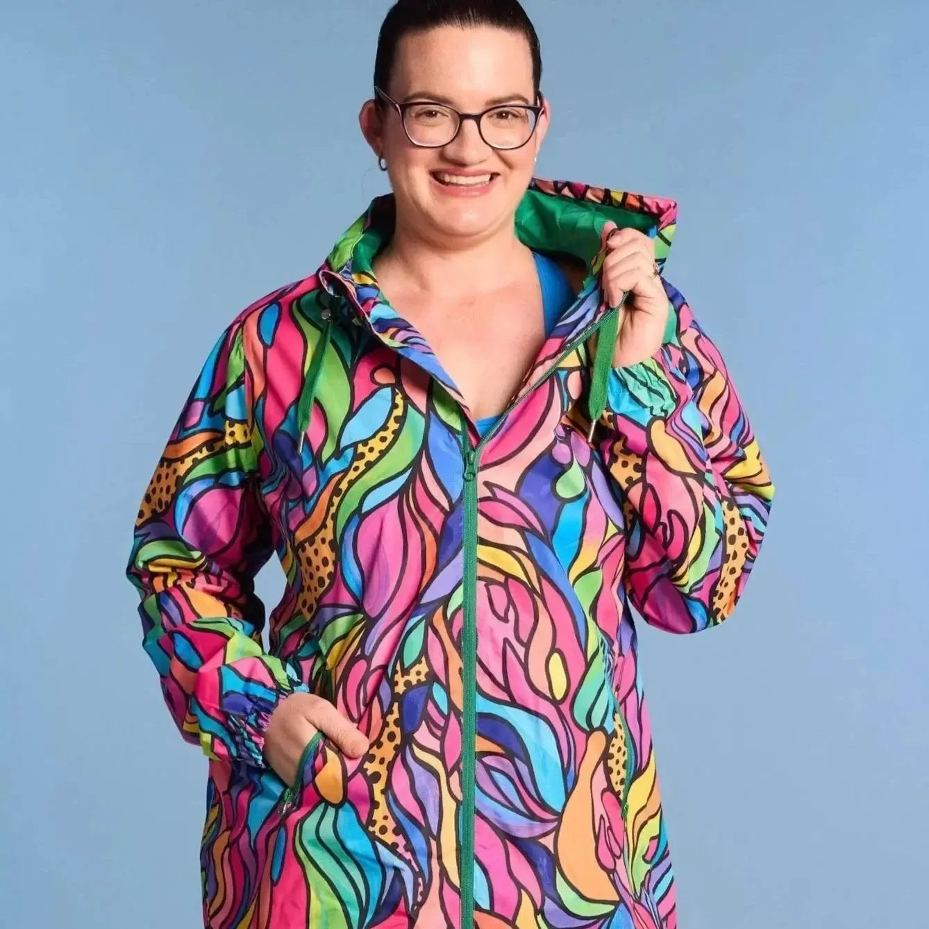 STAY DRY IN COLOURFUL STYLE! 2024 has seen our well loved raincoat become one of our BEST SELLERS in the range. So it was time that we extended on that range and introduce a NEW longline style! With all the features you know and love about our iconic design – properly waterproofed (to 10,000mm!), fully lined, made from recycled plastic bottles, and showcasing stunning artwork by female Australian artists.
