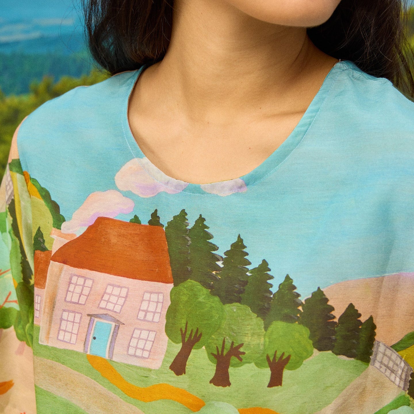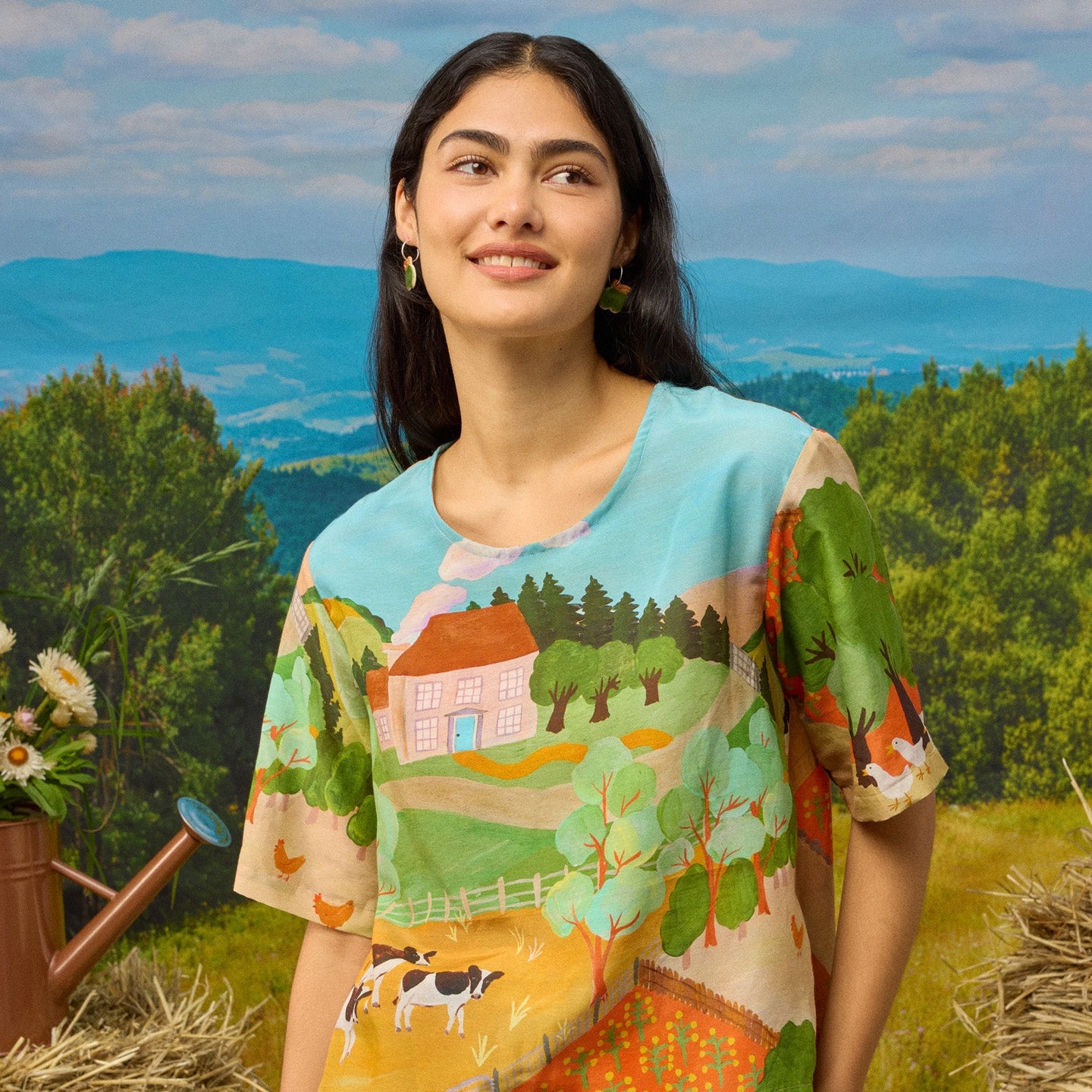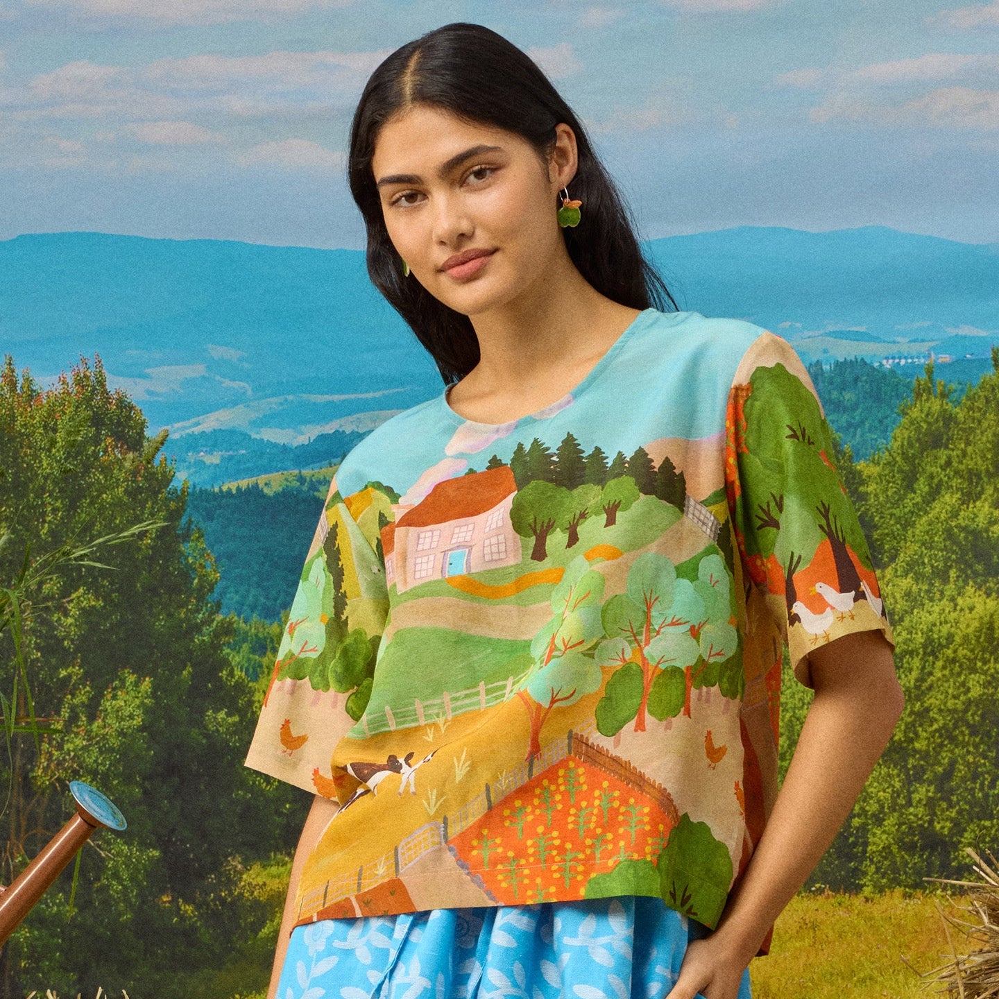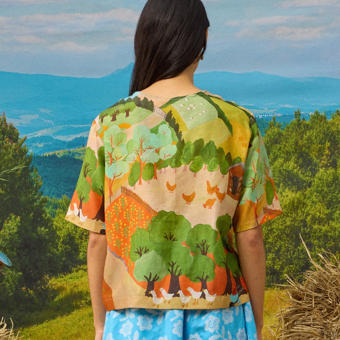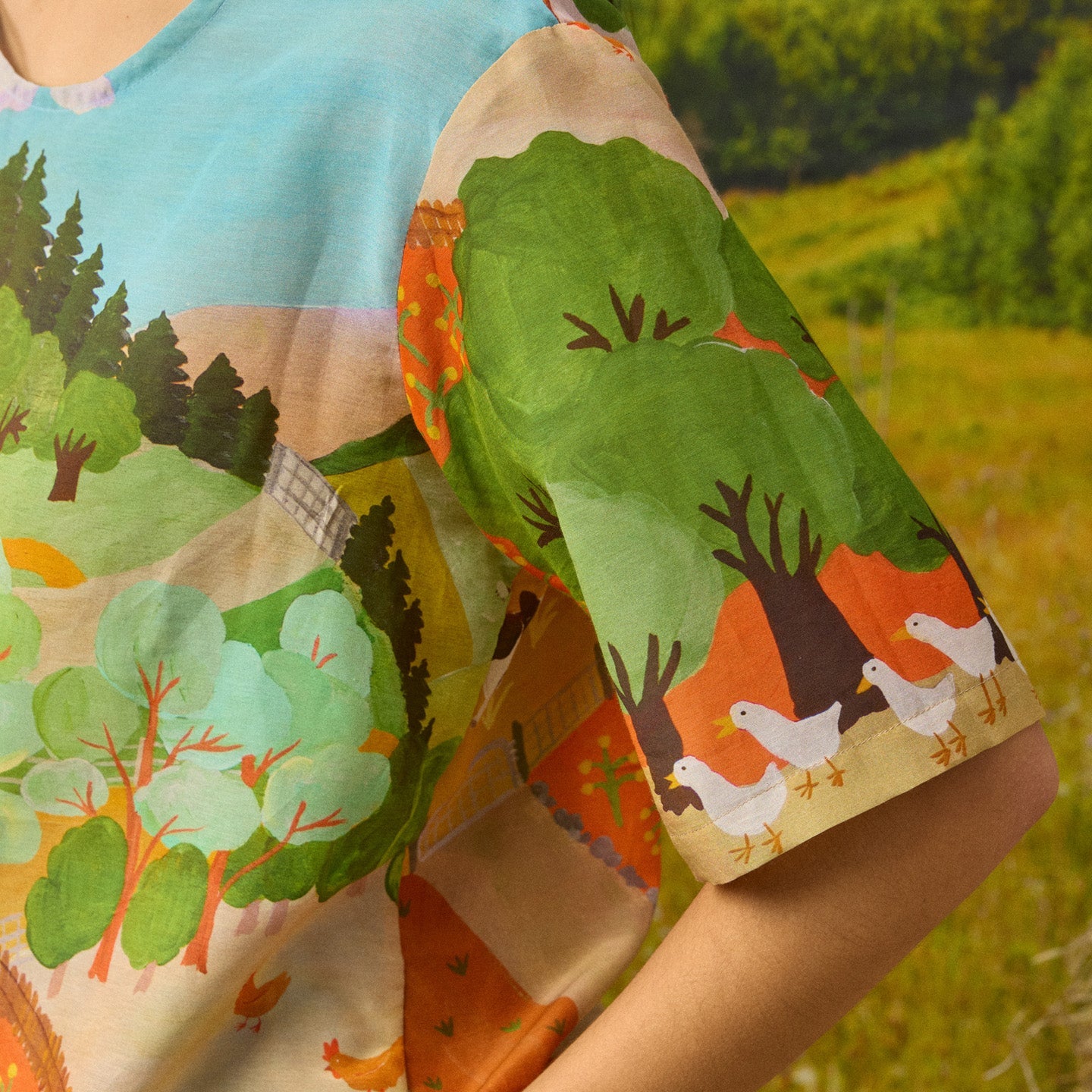 The Silma Blouse showcases our hero Hobby Farm artwork on luxe silk and organic cotton voile, making it just a little bit special for your everyday. Each panel features a different piece of our artwork which has been specifically engineered to fit, resulting in an artwork that wraps around the body.
