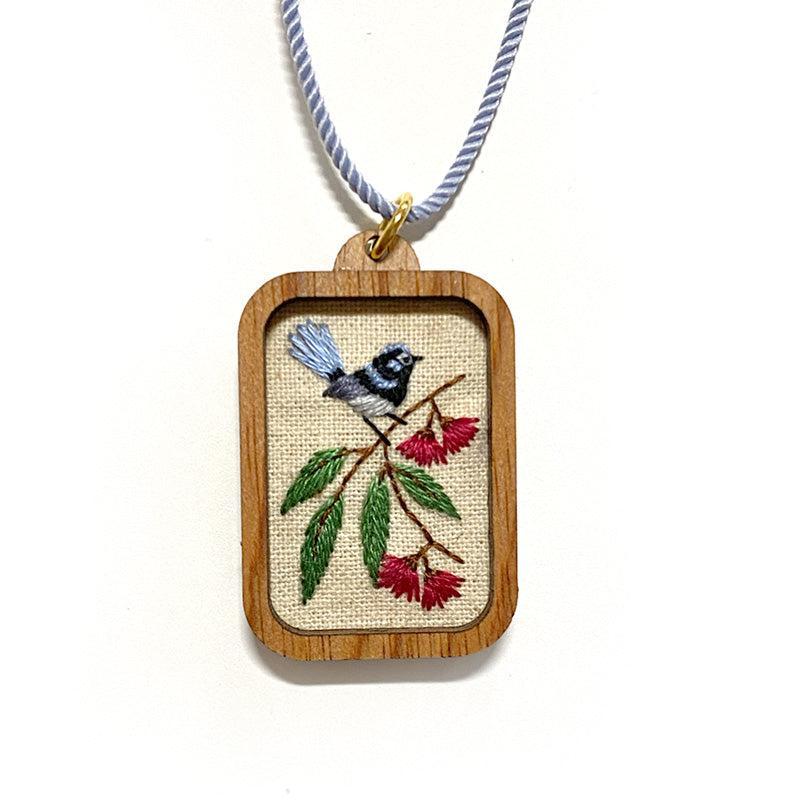 Hand embroidered fairy wren necklace