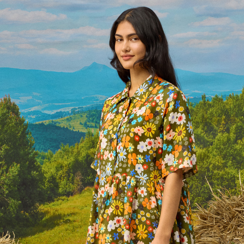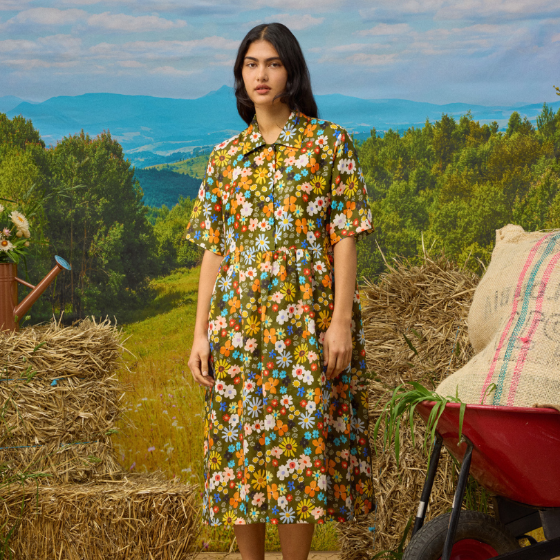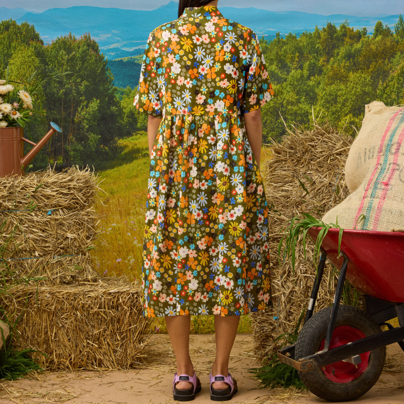 Handmade in Naarm / Melbourne this dress features our signature 'Honey Meadow' textile design digitally printed onto 100% linen. The Honey Meadow artwork celebrates flung together flowers that make for an eyecatching attractant for birds and bees