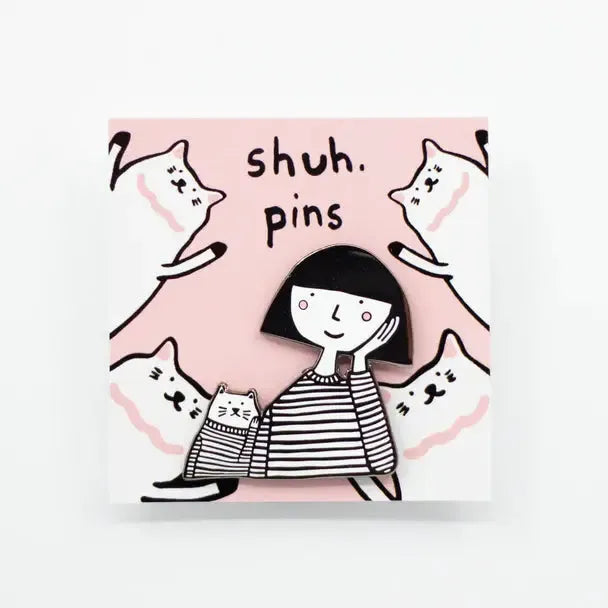 Cute cat pin featuring original illustration by Shuh. Perfect for pinning on your jacket, your backpack, or wherever you need a little bit of feline cuteness.